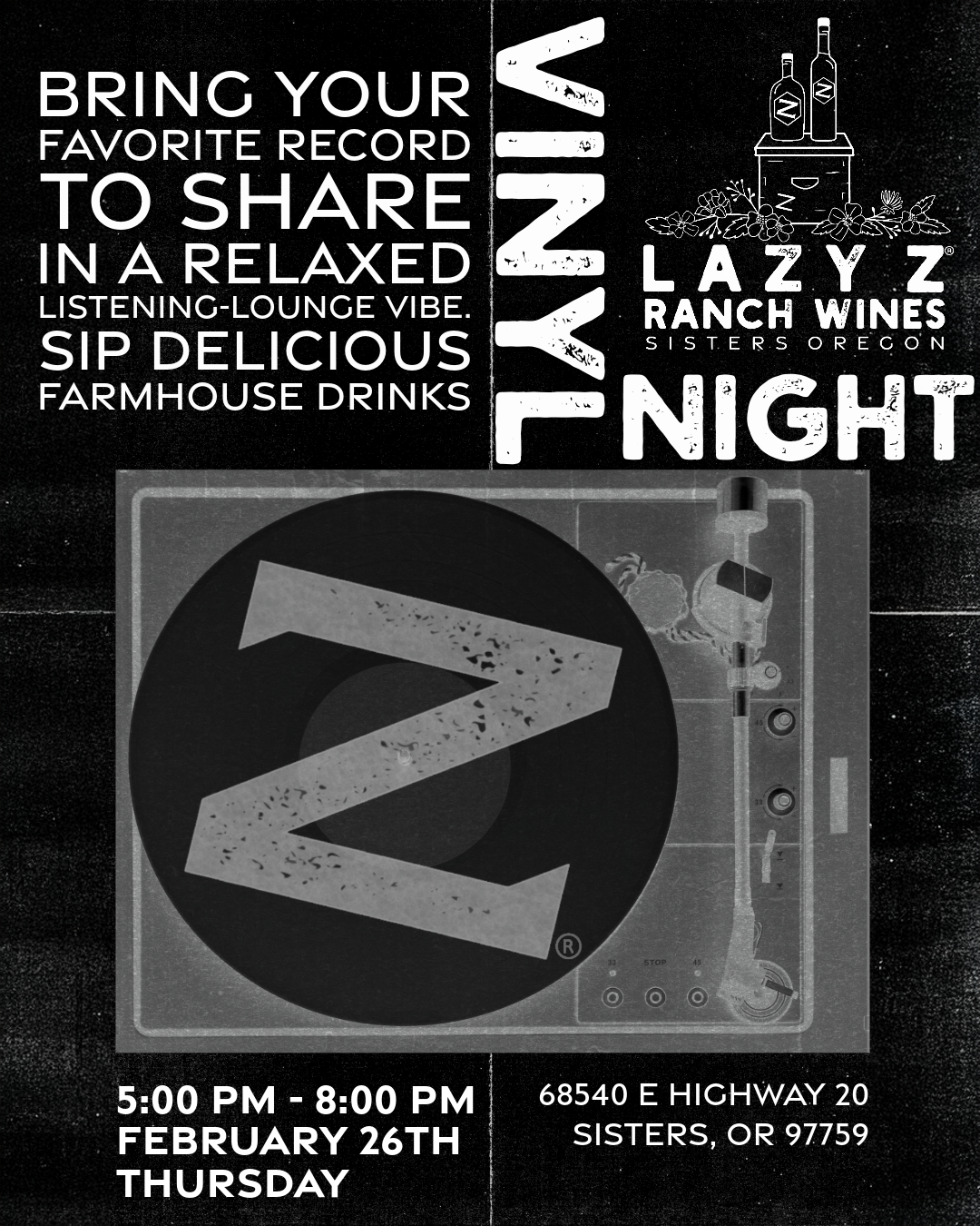 A night for vinyl lovers with ranch wine by the glass, flights, and a cozy listening-lounge vibe.