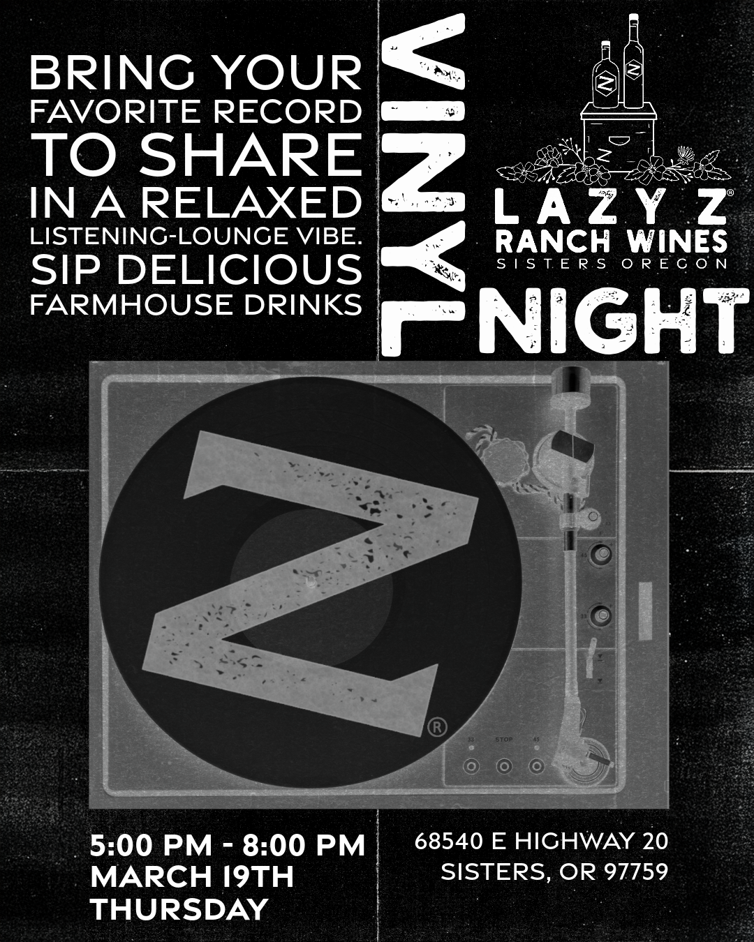 A night for vinyl lovers with ranch wine by the glass, flights, and a cozy listening-lounge vibe.