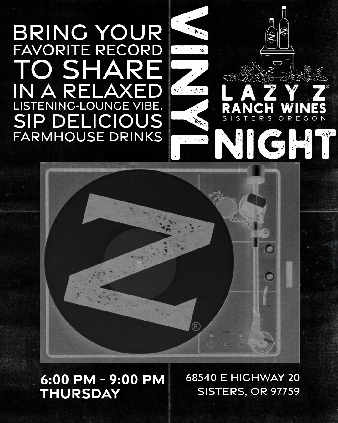 A night for vinyl lovers with ranch wine by the glass, flights, and a cozy listening-lounge vibe.